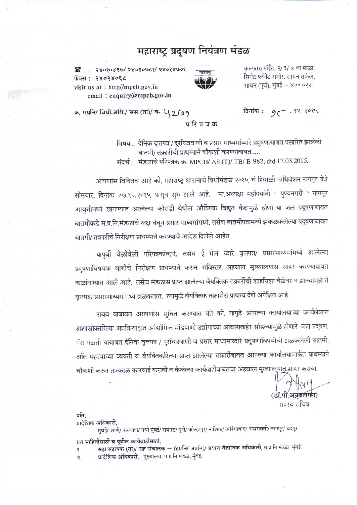 Giving top priority to pollution related complaint news published in daily News papers/Electronic media.